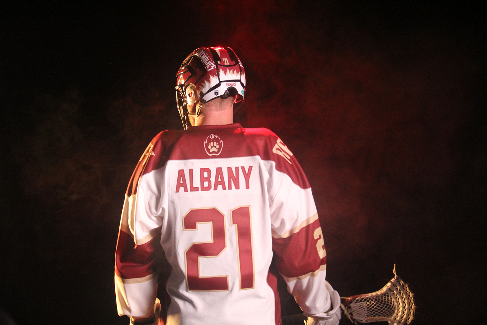 The Albany FireWolves, of the National Lacrosse League (NLL), unveiled both the away and home uniforms ahead of the team’s upcoming inaugural season. The FireWolves will begin the season on the road on December 4 and will don their road white uniforms. These jerseys will feature the FireWolves’ primary logo showcasing the words ‘Albany’ and ‘FireWolves’ in that logo. In addition, the Capital Region is represented prominently with ‘Albany’ being shown running down the side of the shorts. The road whites are accented with maroon and Vegas gold colors around the lettering and numbers.